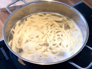 • Nudeln ins kochende Wasser hineingeben und ca. 5 Minuten kochen