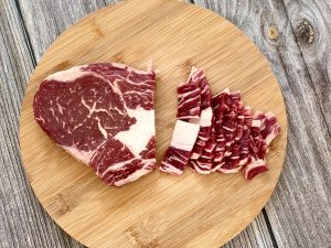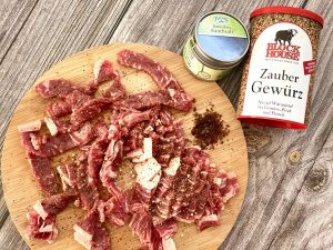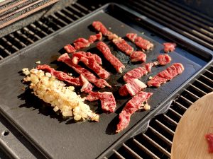 • Jetzt die Steak Streifen auf die Grillplatte legen und scharf aber kurz anbraten