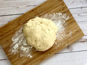 - Den Teig auf eine bemehlte Arbeitsfläche geben und 5 Minuten mit den Händen kneten
