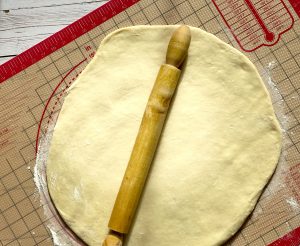 - Danach den Teig wieder auf die bemehlte Arbeitsfläche geben und mit einem Nudelholz ausrollen (ca. 1 cm dick)