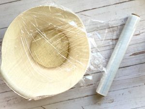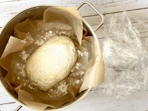 • Den Teig auf ein leicht bemehltes Backpapier legen und in ein größeres Gefäß geben. Mit Frischhaltefolie abdecken und 1 Stunde an einem warmen Ort ruhen lassen