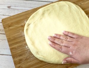 • Mit der Hand jetzt den Teig leicht andrücken und auseinanderziehen (wie eine Pizzaform)
