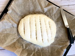 • Nach der Ruhzeit, den Teig zusammen mit dem Backpapier auf ein Backblech legen und mit einem scharfen Messer einschneiden. Das Brot wird bei 180 Grad ca. 25 Minuten gebacken – bis es schön goldbraun geworden ist. In den Backofen noch eine Schale mit Wasser auf den Boden des Ofens stellen.