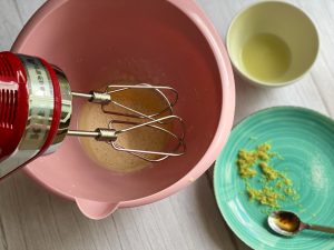 - Zitronenabrieb, Zitronensaft, Salz und Vanilleextrakt zu der Eiermasse geben und vermengen