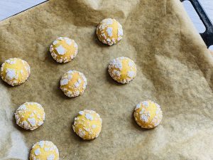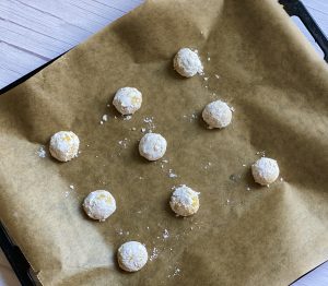 - Alle Plätzchen auf ein mit Backpapier ausgelegtes Blech legen (bitte mit etwas Abstand)