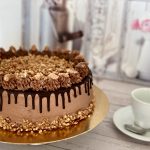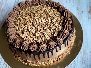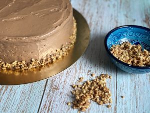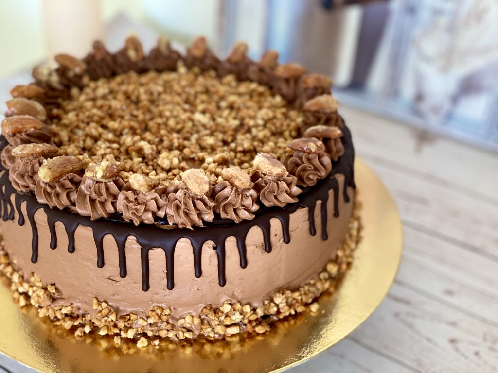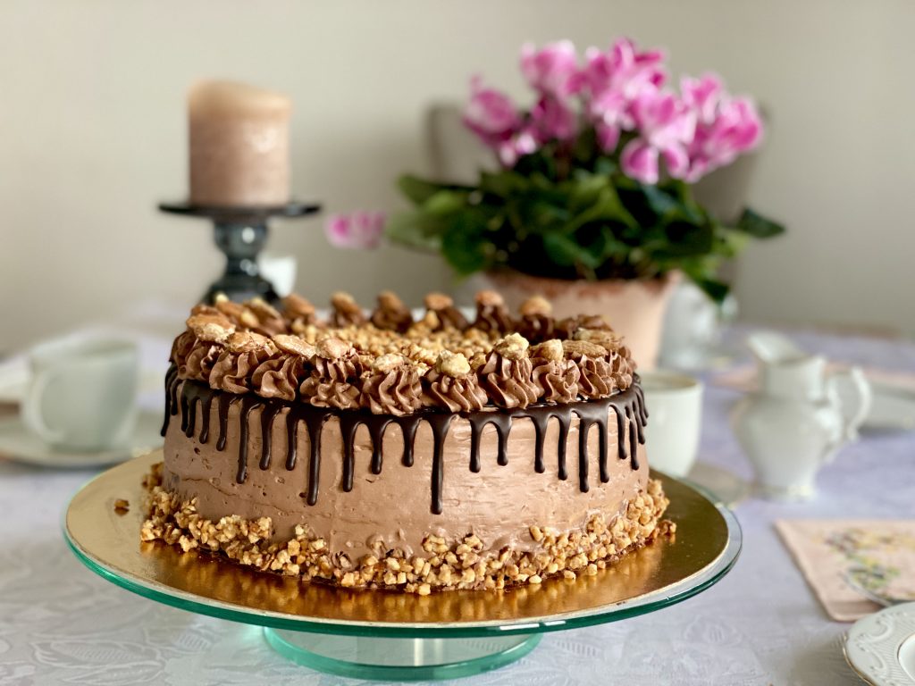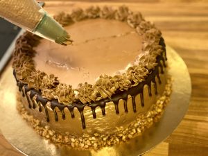 • Torte dekorieren: Am unterem Tortenrand die hälfte der karamellisierten Nüsse rund um verteilen (gehakte Nüsse in einer Pfanne anrösten und mit 3 EL Zucker karamellisierten, danach auf Backpapier legen und auskühlen)
