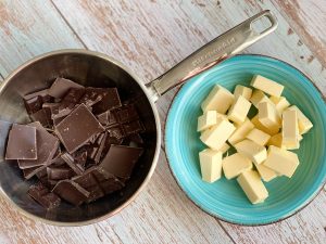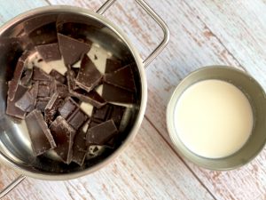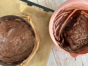 • Buttercreme: Sahne aufkochen und über die Schokolade (vorher klein brechen) geben und 5 Minuten stehen lassen. Danach gründlich vermengen und auskühlen lassen