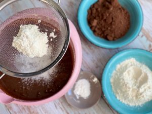• Mehl, Kakao und Backpulver sieben und zu der Schoko-Eiermasse hinzufügen