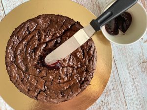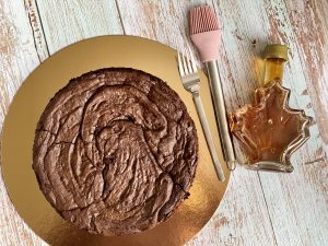 • Torte bauen: 1 Brownie Boden nehmen und auf eine Tortenunterlage legen. Mit einer Gabel von oben einstechen und Ahornsirup drüber verteilen (Menge beliebig)