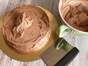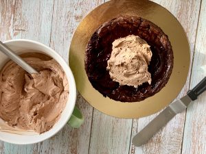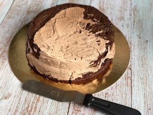 • Danach die Torte nochmal mit Buttercreme bestreichen und mit der Tortenspachtel gründlich glatt streichen (danach 1 Stunde kalt stellen)