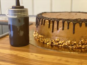 • Kuvertüre erwärmen und abkühlen, in eine Spritzflasche geben und am oberen  Rand der Torte herunterfließen lassen