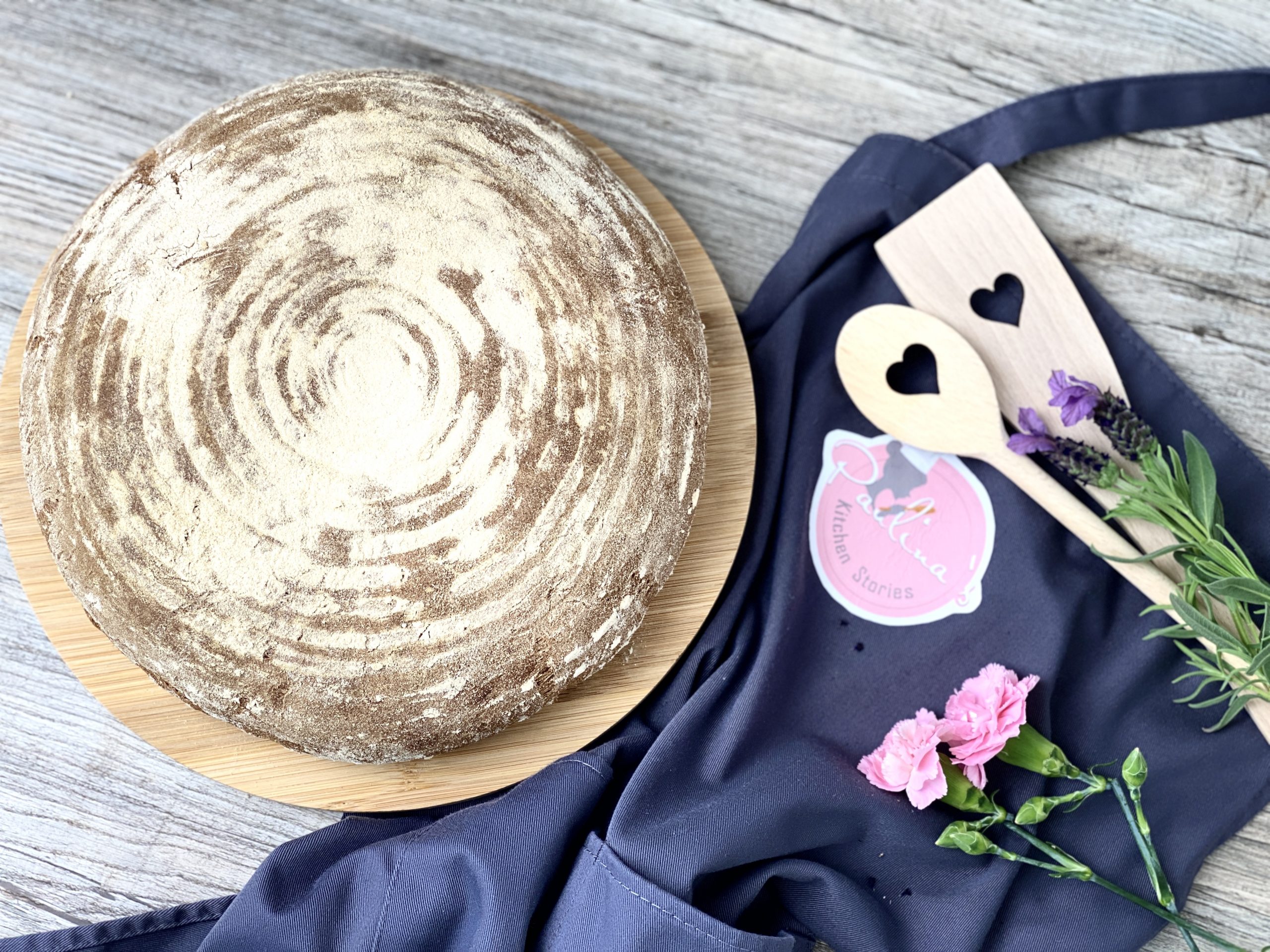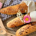• Nach der weiteren Gehzeit, formen wir den Teig zu einer Rolle und legen diese auf ein Baguette-Backblech. Die Baguettes schräg anschneiden und den Körner Mix drauf verstreuen. Danach 10 Minuten stehen lassen. Dann kommen die Baguettes in den Ofen für 40 Minuten . Nach der Backzeit wickle ich sie noch für 10 Minuten in ein sauberes Küchentuch, so bleiben sie außen knusprig und innen weich (und die Kruste ist nicht hart).