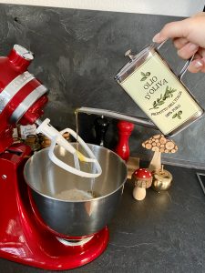 • Das gesiebte Mehl kommt in eine Schüssel und wir fügen das Olivenöl hinzu