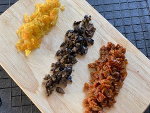 • In der Zwischenzeit können wir die Oliven, getrocknete Tomaten und die Peperonis klein schneiden