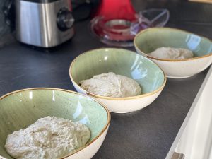 • Den Teig in drei gleich große Stücke teilen und in kleinere Schalen geben.