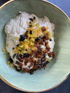 • Hinzu kommen jeweils unsere klein geschnittenen Oliven, Tomaten und Peperonis. Alle Zutaten danach gut verkneten