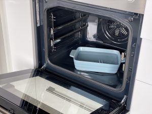 • Den Backofen auf 200 Grad Ober-/ Unterhitze vorheizen und auf den Boden des Backofen legen wir eine Auflaufform mit Wasser gefüllt rein.