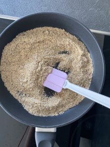 • Die gemahlenen Haselnüsse in der Pfanne kurz anrösten (so schmeckt der Biskuit viel nussiger und ist viel aromatischer. Die Nüsse auskühlen lassen