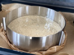 • Der Teig kommt jetzt in den Tortenring, ausgelegt mit Backpapier