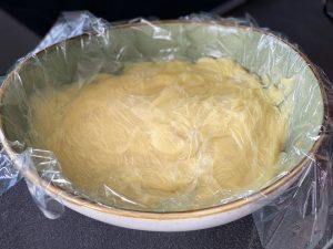 • Buttercreme: Puddingpulver mit 4 EL Zucker, 1 TL Vanilleextrakt zusammen verrühren, restliche Milch aufkochen und den Pudding-Mix hinzufügen. Hitze reduzieren und solange rühren bis eine dickflüssige Masse entsteht. Das füllen wir in eine Schale um und decken es mit Frischhaltefolie ab. Den Pudding jetzt auf Zimmertemperatur auskühlen lassen
