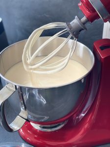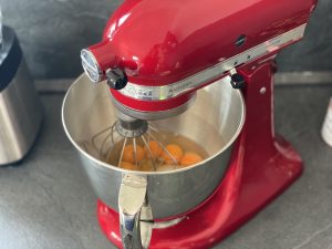 • Biskuitboden: Die Eier mit Zucker, Vanillezucker und Salz 15 Minuten in der Küchenmaschine zu einer cremigen Masse aufschlagen