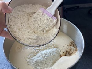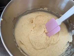 • Hinzu kommen noch das Mehl und Backpulver (bitte die zwei Zutaten sieben) Alles ganz vorsichtig unterheben (per Hand)