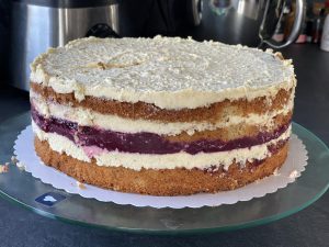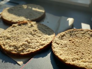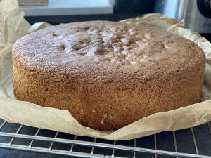 • Sobald der Biskuit kalt ist – in 3 gleich große Scheiben schneiden