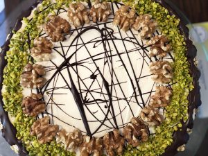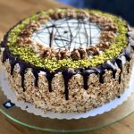 • Torte dekorieren: Mascarpone mit Puderzucker vermengen und damit die Torte komplett abdecken. Mandeln in einer Pfanne anrösten, abkühlen lassen und damit den Rand der Torte ganz abdecken. Die Kuvertüre erwärmen und oben an der Kante der Torte entlang gehen und immer wieder etwas mehr von der Schokolade runtertropfen lassen. Den Rest davon einfach frei auf der Torte mit einem Löffel verteilen. (ZickZack Muster) oben drauf kommen noch die Pistazien und Walnusshälften.