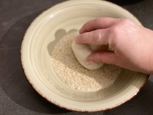 • 2 Schalen vorbereiten: 1 mit etwas Wasser und die andere mit euren Lieblingskörnern zum Bestreuen. Das Brötchen erst in Wasser tunken und anschließen in den Körnern wälzen