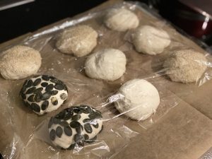 • Die Brötchen auf ein Backpapier legen und mit Frischhaltefolie und Trockentuch abdecken. Jetzt 1,5 Stunden ruhen lassen