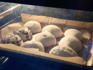• Nach der Gehzeit kommen die Brötchen in de Backofen (250 Grad, Ober/ Unterhitze)für 20-25 Minuten. Wichtig: In den Backofen auch eine Auflaufform mit heißen Wasser reinstellen (auf den Boden des Ofens) Sobald die Brötchen aus dem Ofen kommen, wickel ich Sie in ein Küchentuch… für ca. 5 Minuten