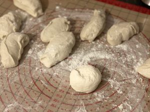 • Am nächsten Tag den Teig auf bemehlte Arbeitsfläche geben und vorsichtig in die Länge ziehen. Daraus 8 gleiche Stücke abschneiden und in eine Kugel formen.