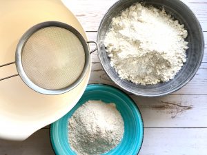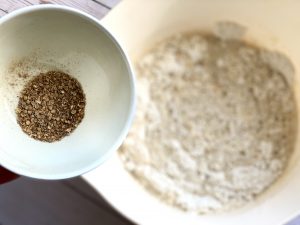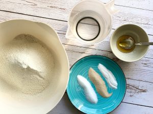 • Salz, Honig, Zucker, Trockenhefe und Wasser zu dem Mehl geben