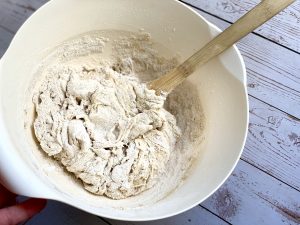 • Mit einem Kochlöffel vermengen, bis die Masse fester wird