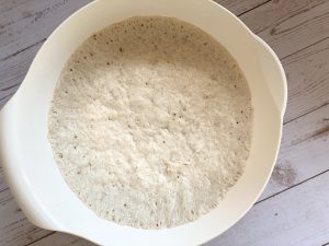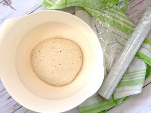 • Teig in eine Schüssel geben, mit Frischhaltefolie und einem Tuch abdecken und 3 Stunden an einem warmen Ort gehen lassen